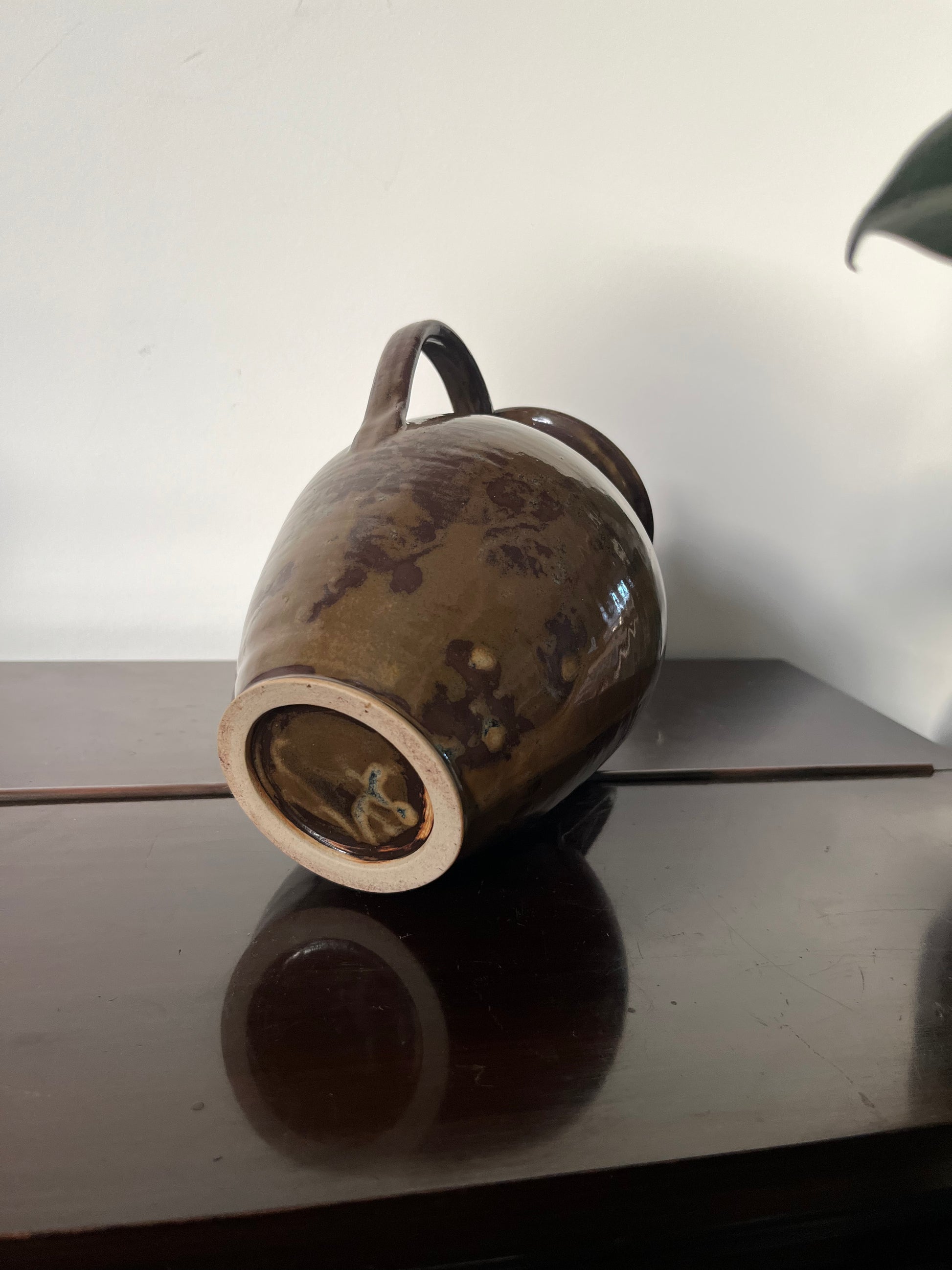 Double-handled amphora vase in walnut glaze. Bears the marks of being handmade with variation in glaze.