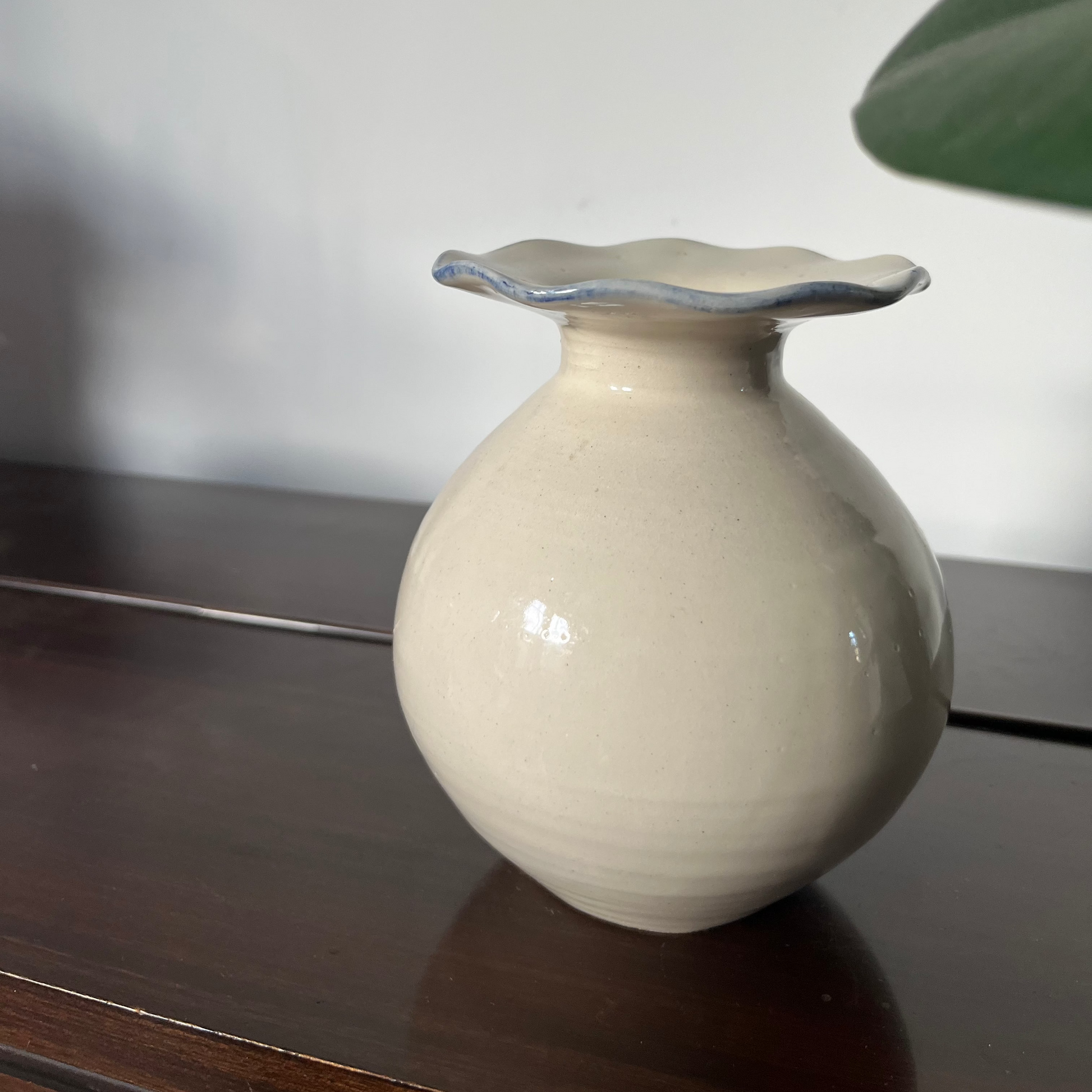 Shiny Staffordshire stoneware vase with a flared wavy rim brushed with cobalt. Perfect for a small bunch of flowers.