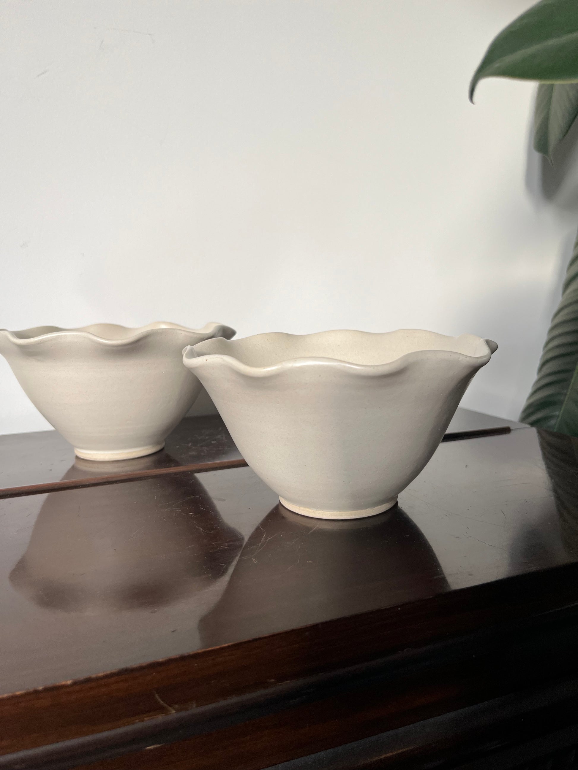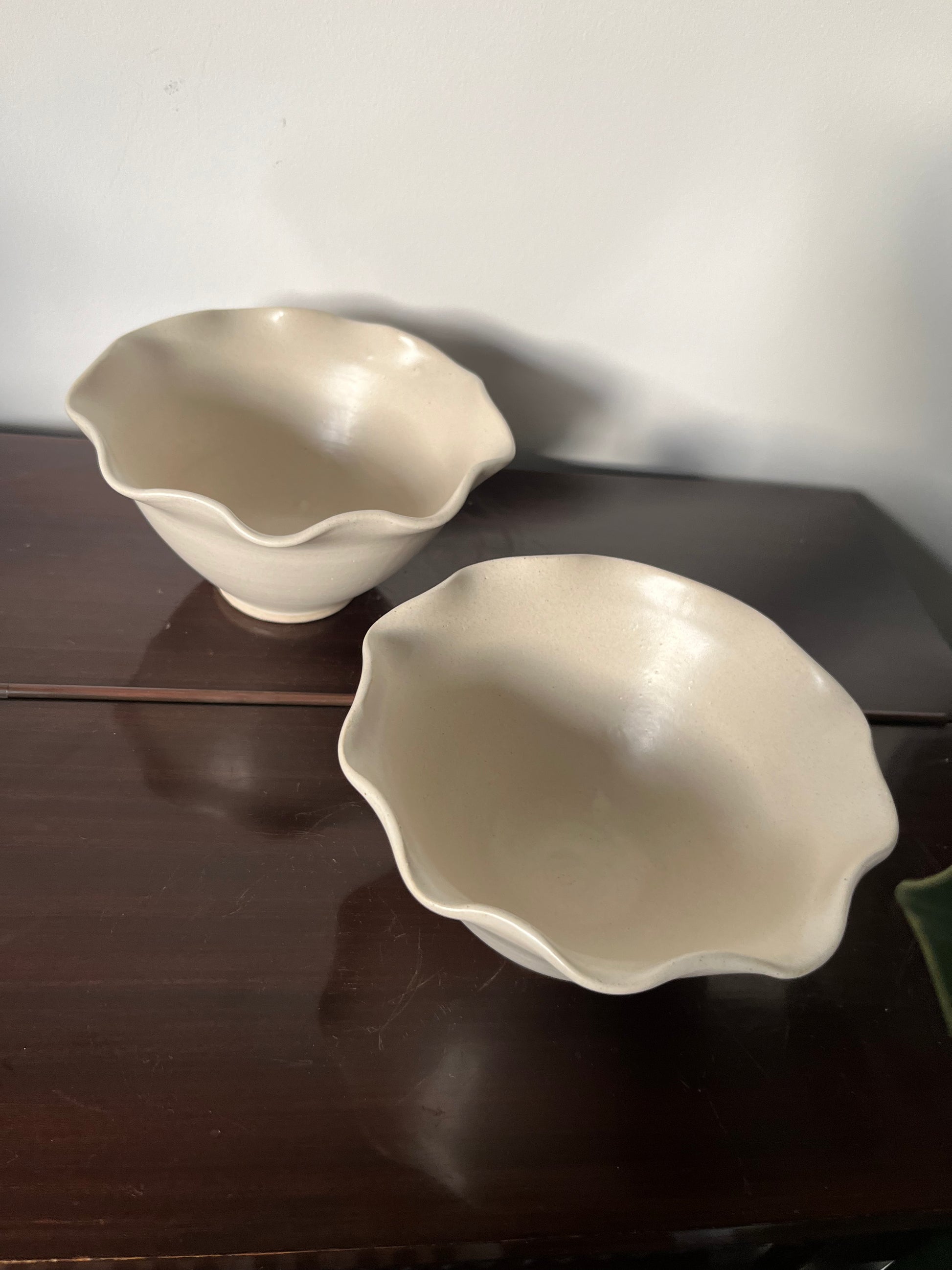 Breakfast bowls with a soft waved rim. Glazed in a satin off-white/cream.