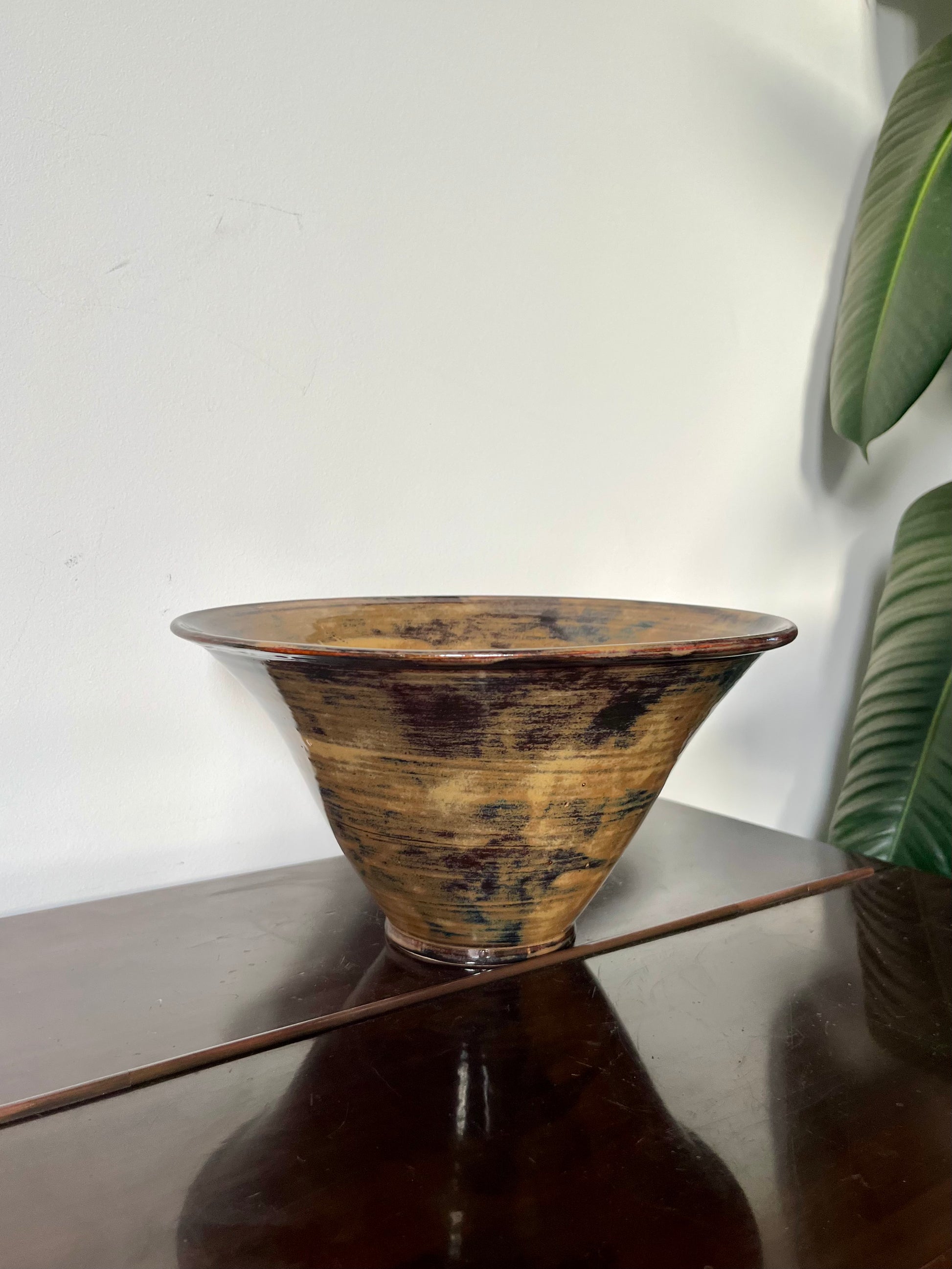 Pot ideal for plants and specifically bulbs, with wide opening. Wheel-thrown in Staffordshire stoneware and glazed in variegated brown glaze.